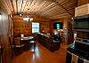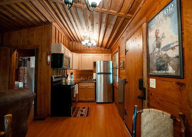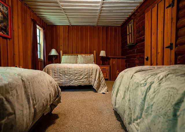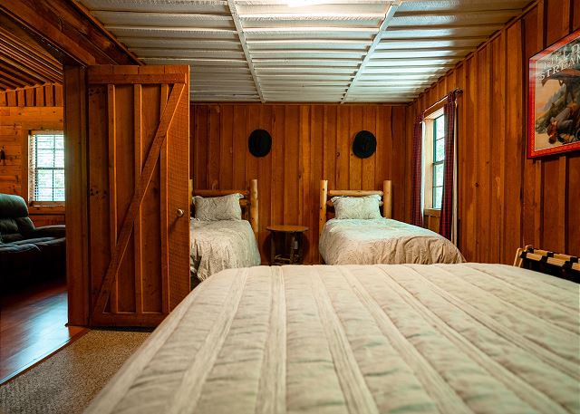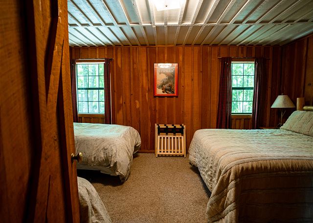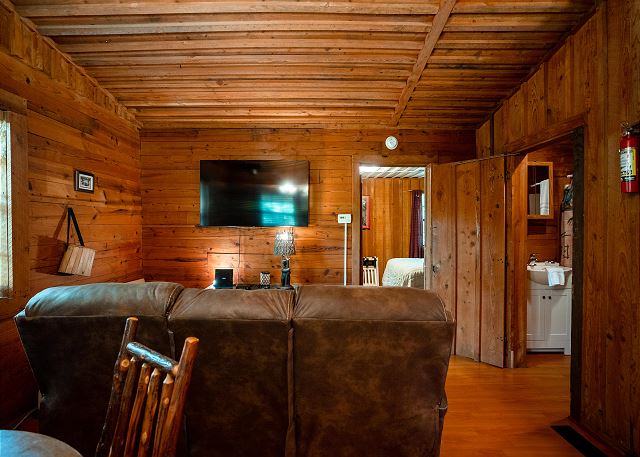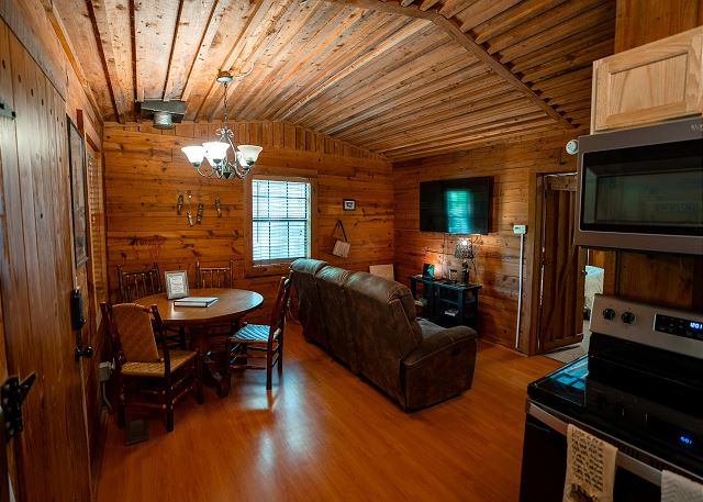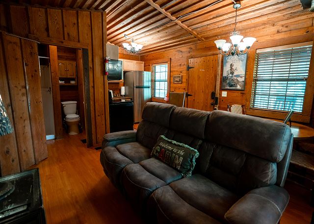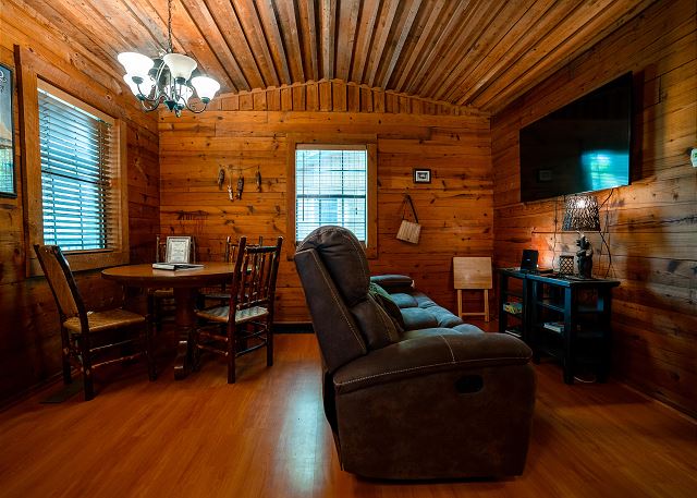 This cozy cabin has a classy rustic charm, with everything a group needs for a fishing getaway. Although it has only one bedroom, the log cabin sleeps 4 with one queen bed and two twin beds. It also features a fully equipped kitchen, seating for four, and a smart TV.
