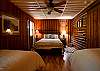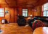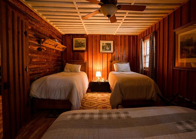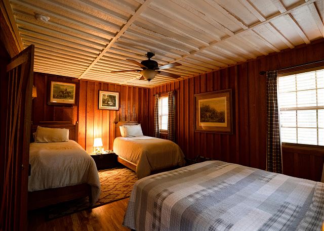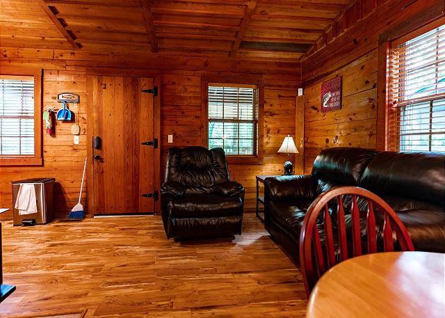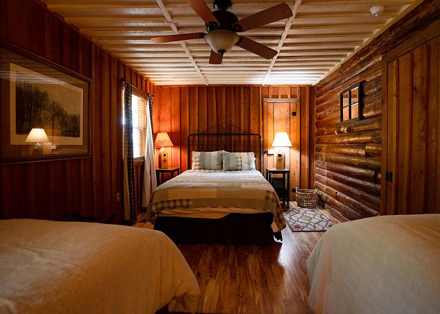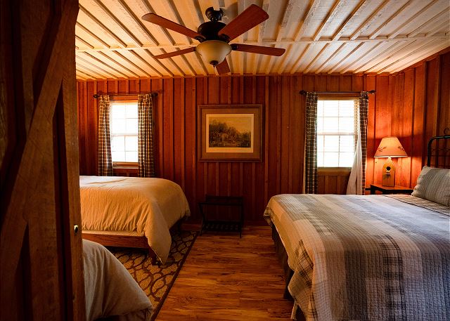 This cozy cabin has a classy rustic charm, with everything a group needs for n fishing getaway. Although it has only one bedroom, the log cabin sleeps 4 with one queen bed and two twin beds. It also features a fully equipped kitchen, seating for four, and a smart TV.