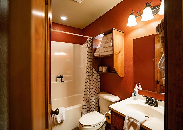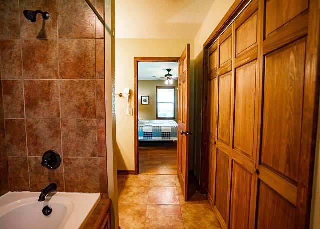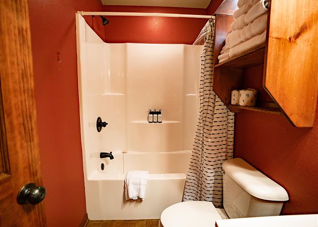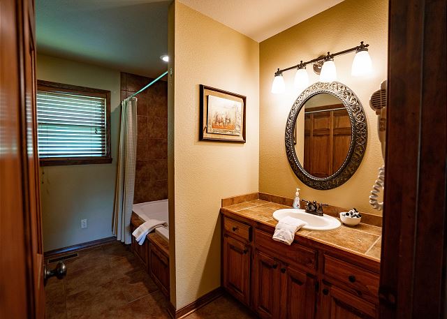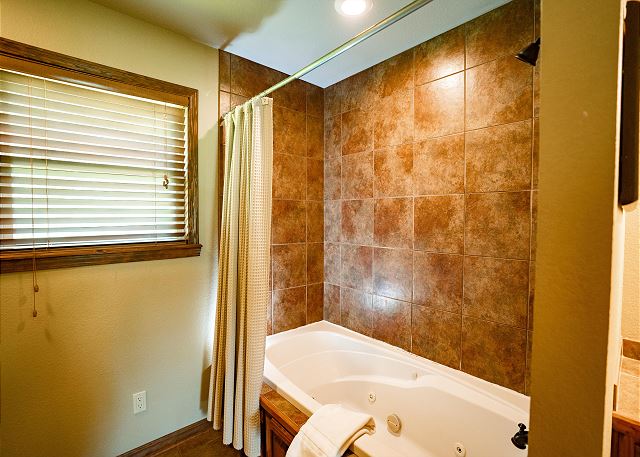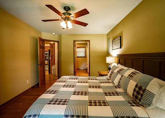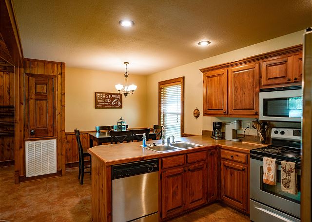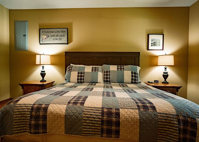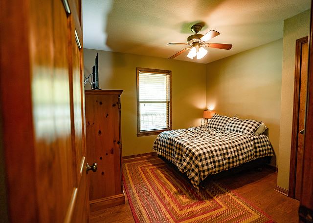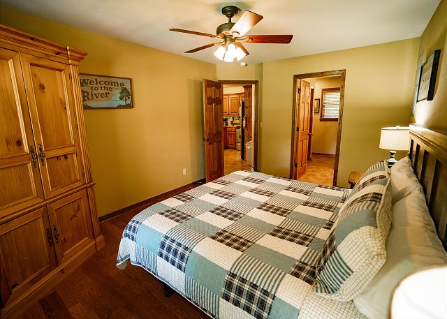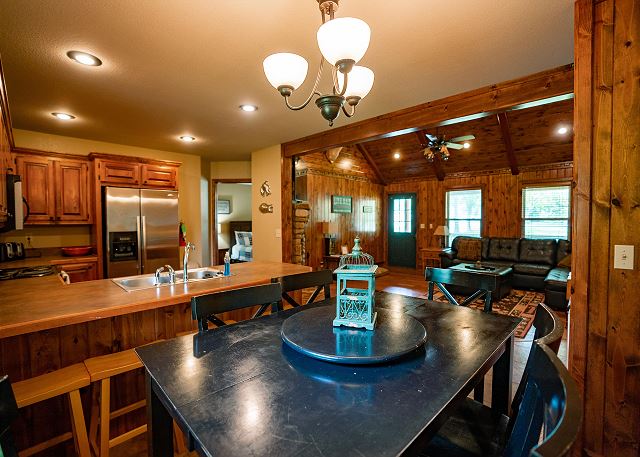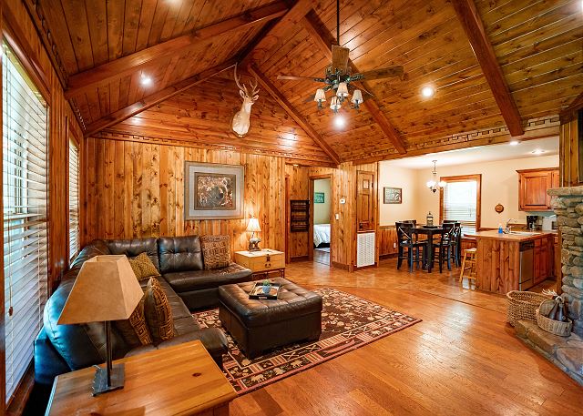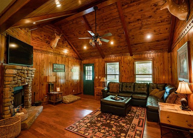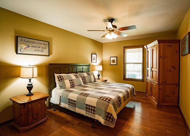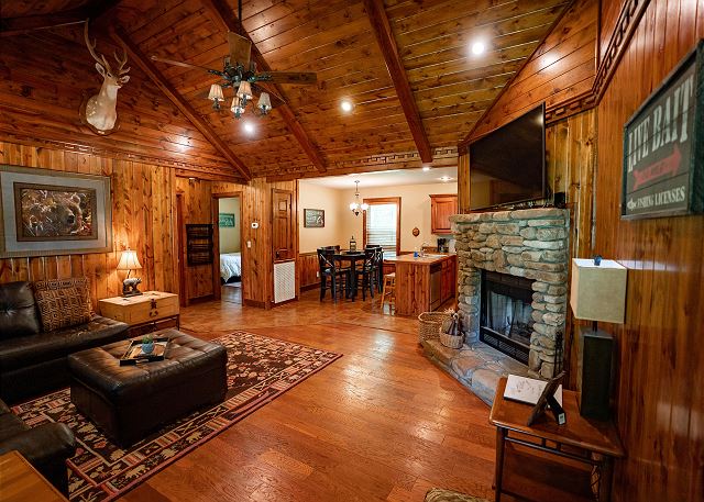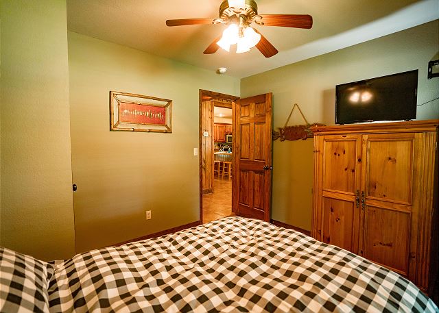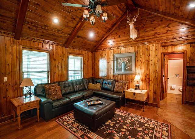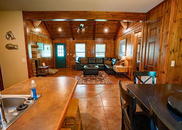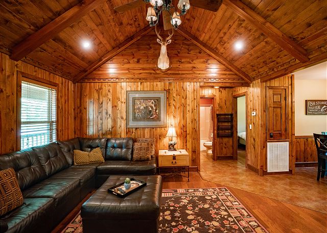 You’ll step inside and be greeted by a river themed cabin. The living room has a rock log fire place and a smart tv where you can stream your favorite shows after a long day of fishing on the Little Red River for the perfect catch of world class trout. You’ll find the master bedroom with a king size bed and en suite with a jacuzzi tub, two twin beds in the second bedroom, and a queen in the third bedroom. Plus a fully functioning kitchen and an additional bathrooms. Your family can also enjoy playing games or grilling outside at the end of the day in the spacious yard.